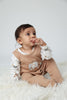 How about dressing your little munchkin in a sweet and stylish outfit? SheerHugs has just the right piece of adorable Romper+Top set, crafted with 100% organic cotton fabric that's soft as a cotton. This cute and gentle ensemble features a romper in a charming brown color adorned with an elephant design, and an inner top printed with delightful animal cartoons. The natural color of the fabric is free from harmful dyes, ensuring maximum comfort for your little one's sensitive skin. With its high-quality construction and attention to detail, SheerHugs' Romper+Top set is a perfect choice for your baby boy's wardrobe. So, why wait? Dress your little one in SheerHugs' cute and gentle Romper+Top for a stylish and comfortable look!