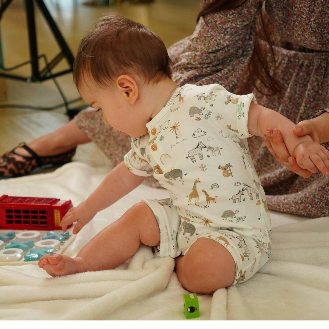 Searching for the most adorable outfit for your little prince? How about SheerHugs' Baby Body - a perfect blend of cuteness and comfort! Made with 100% organic cotton fabric that's as soft as cotton candy, this baby romper is designed for baby boys who deserve the best. With a gentle and cute language, this natural-colored romper features delightful animal cartoons printed all over, adding a playful touch to your baby boy's wardrobe. Crafted with care and attention to detail, SheerHugs ensures that your baby boy stays snug and stylish in this precious ensemble. So, why wait? Dress your little one in SheerHugs' Baby Body and watch him melt hearts with his irresistible cuteness!